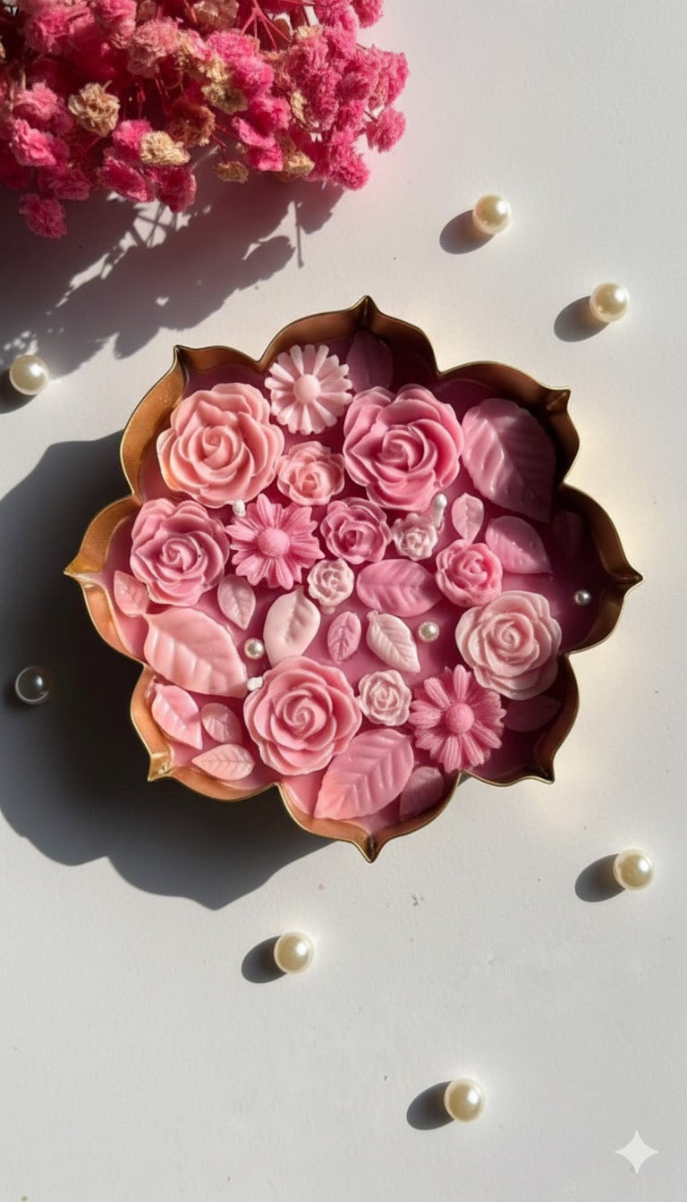 Sarovar Cups bring that calm home. Each cup is a tiny pond: rose blooms resting on green pads, poured over a bed of dried tulsi. As the candle pools, the serene aqua turns luminous and the room settles into prayerful quiet. Keep them by the altar, set three along a windowsill, or gift them with a handwritten shubh-laabh note.
