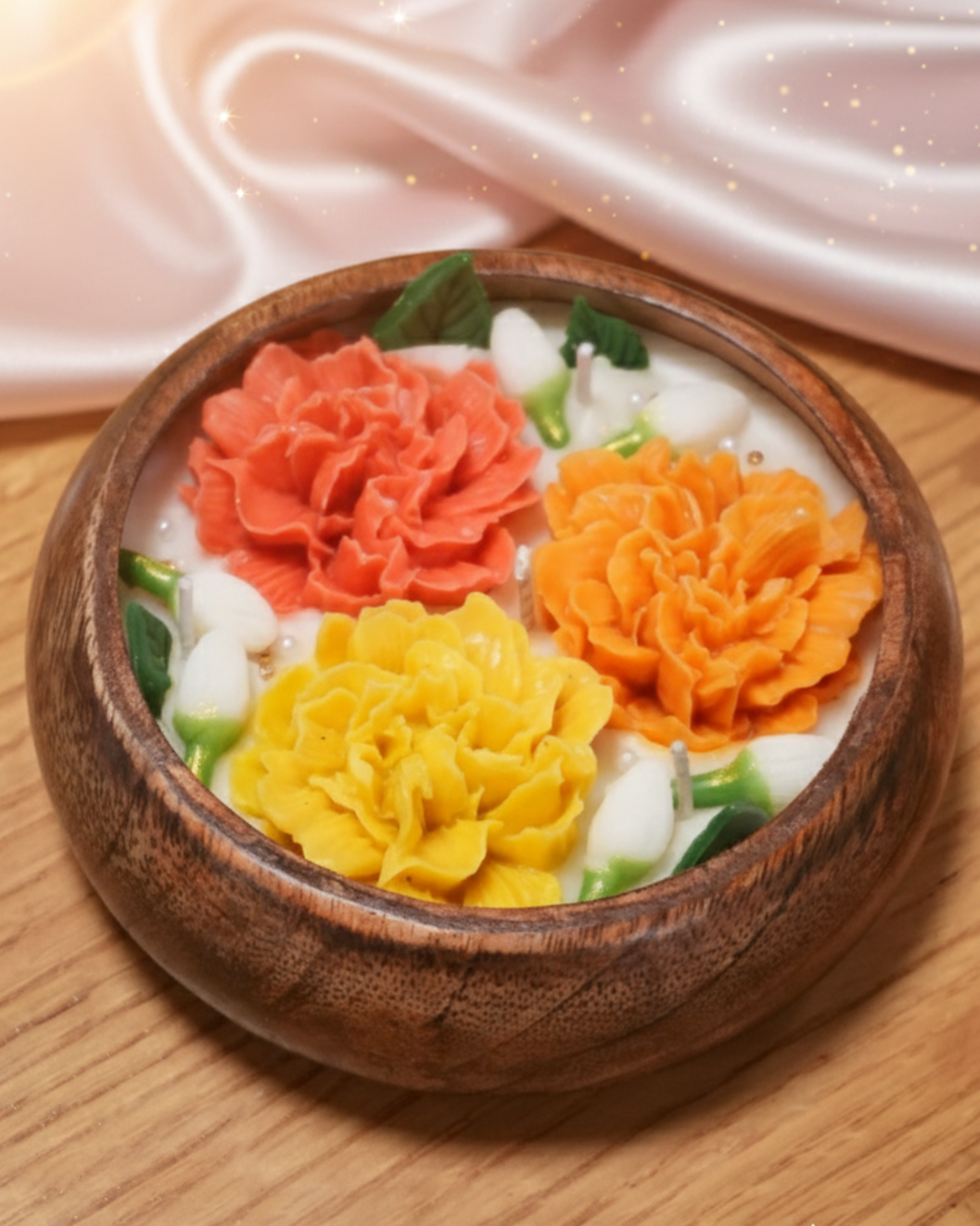 A pop of rangoli-like joy. These vibrant daisy-topped cups reveal dried petals as they melt, filling the home with color and warmth.