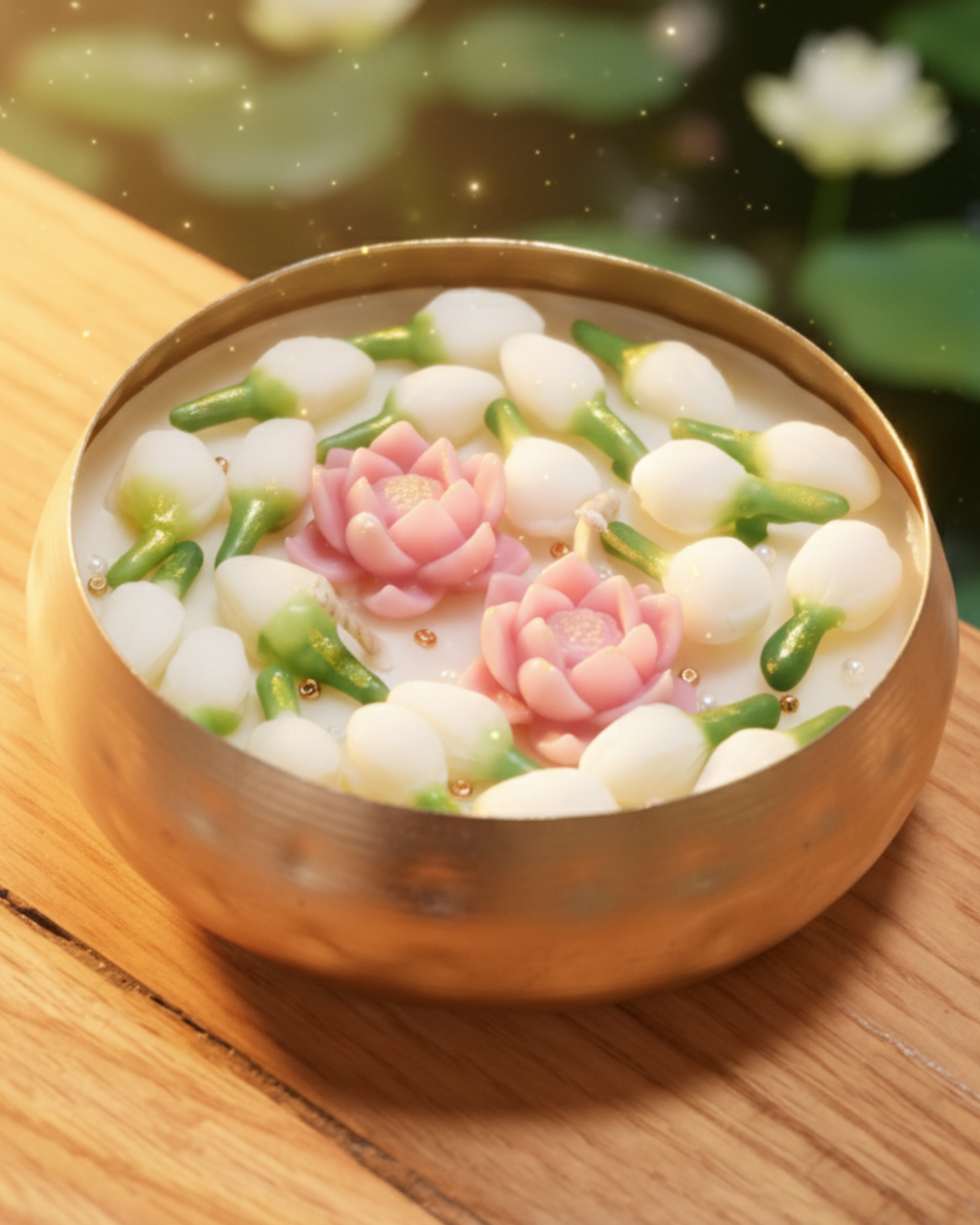 A sculpted lotus garden floating on luminous blue, infused with dried mogra and marigold. Light the multiple wicks to create a mirror-like glow perfect for festive tablescapes.