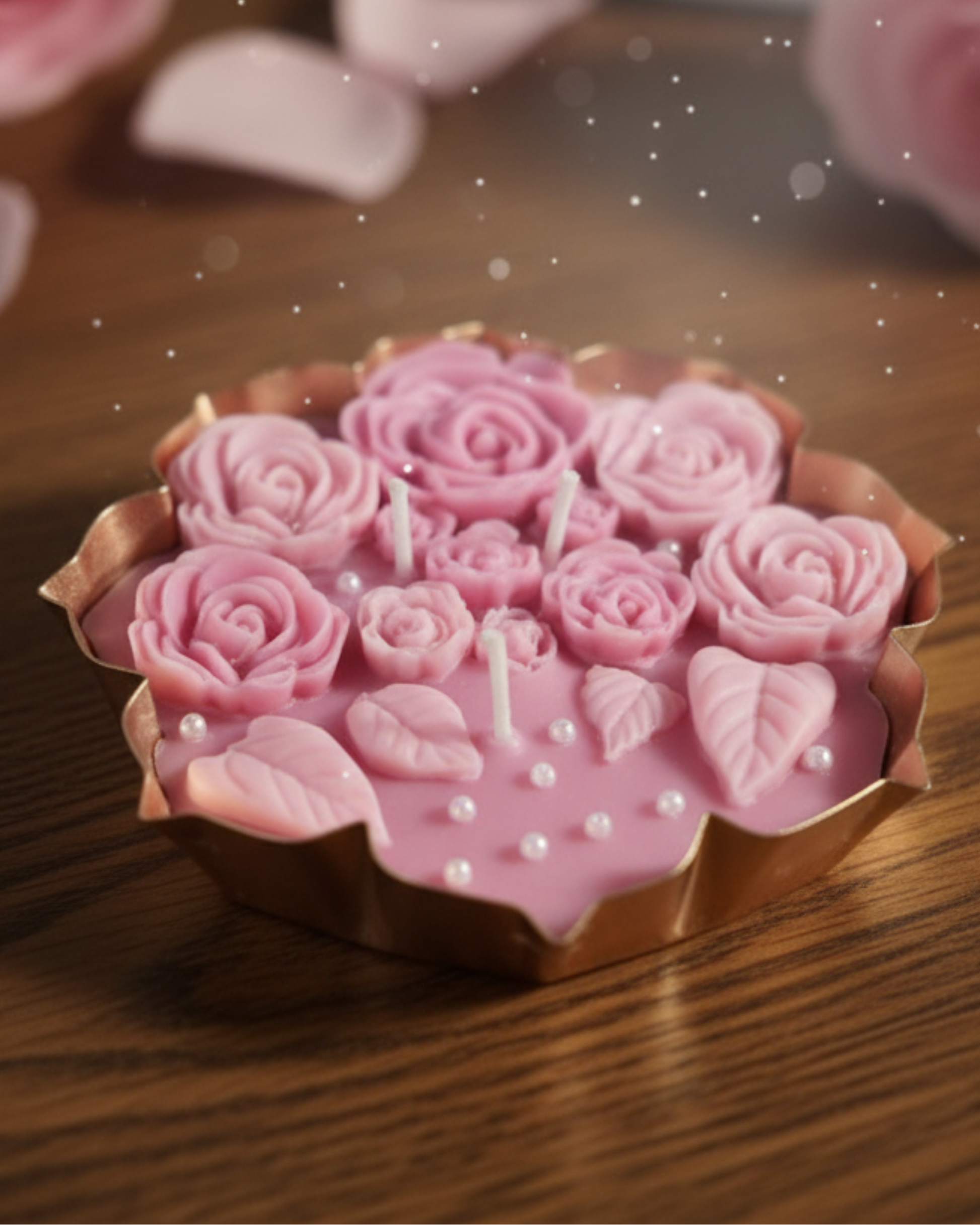 Calming pond-like cups with rose blooms and tulsi beneath serene aqua wax. Ideal for quiet corners, altars, or gifting with love.