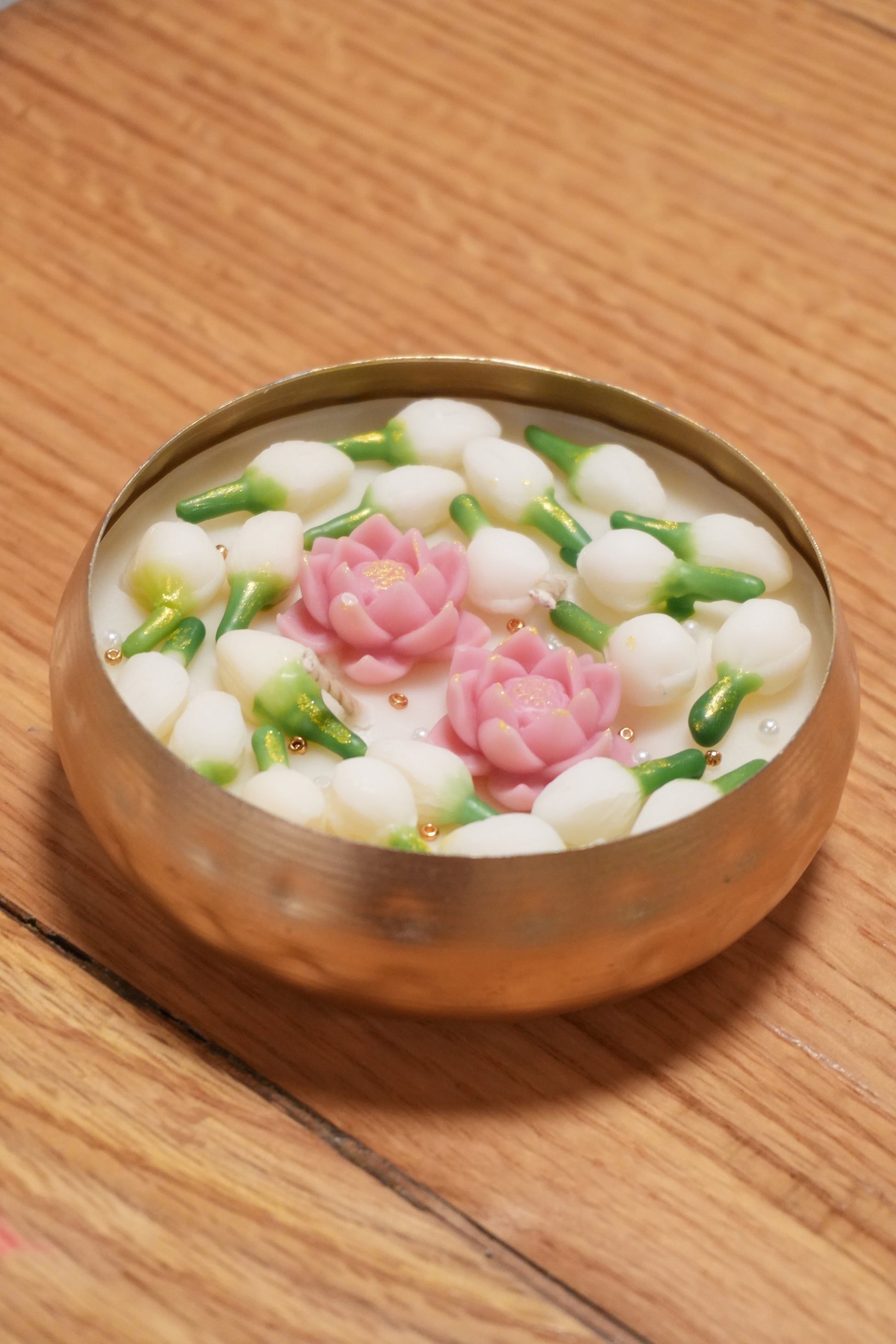 Sunehri Urli Sarovar reimagines that ritual—golden like haldi, joyous like genda, crowned with blossoming pink kamal and dotted pearls. The first burn releases saffron-marigold warmth; as the pool deepens, gilded specks glint like aarti flame. Place it near the doorway or puja ghar; let it greet guests with abundance and carry the house gently from bustle to blessing.